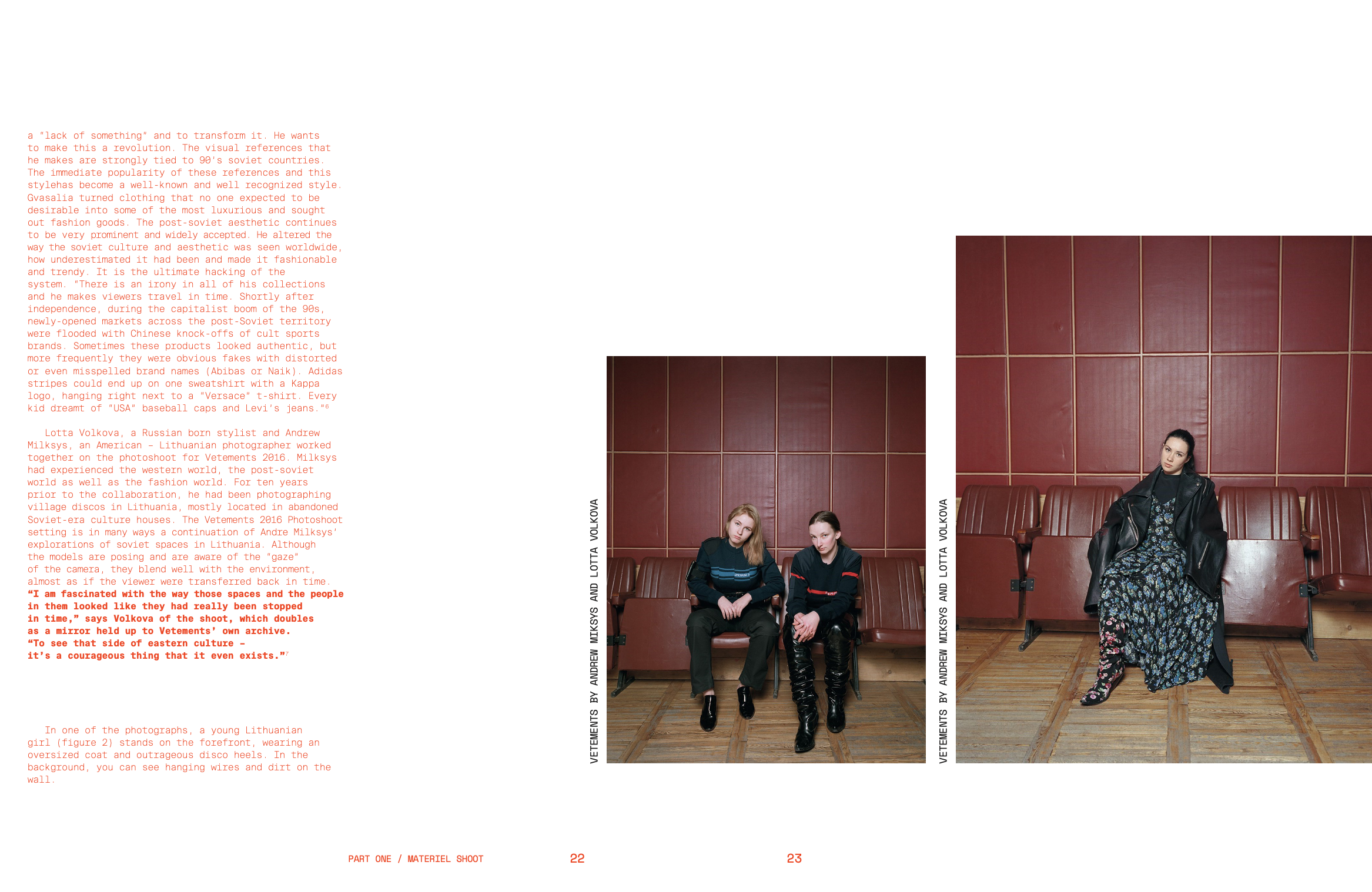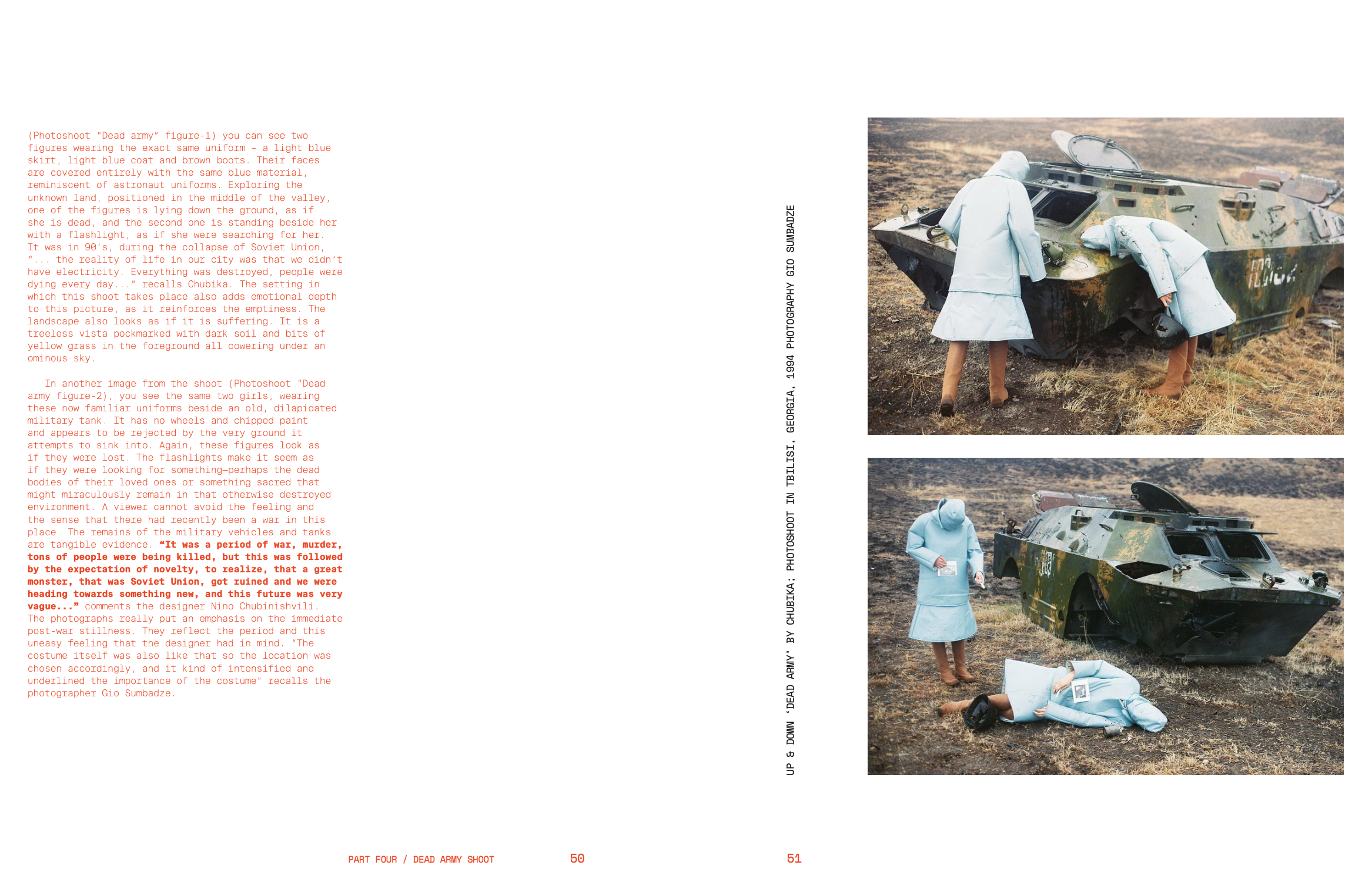 While Georgia’s national identity is still in the process of shedding the remnants of repressive Soviet control, the “new” is partly represented by an adaptation to the rest of the world as perceived by Georgians themselves, and partly by the idea of freedom that the West symbolized during the years where creativity was controlled and regulated by the state. These changing notions of Georgian identity are mirrored and explored within both fashion and particularly fashion photography.