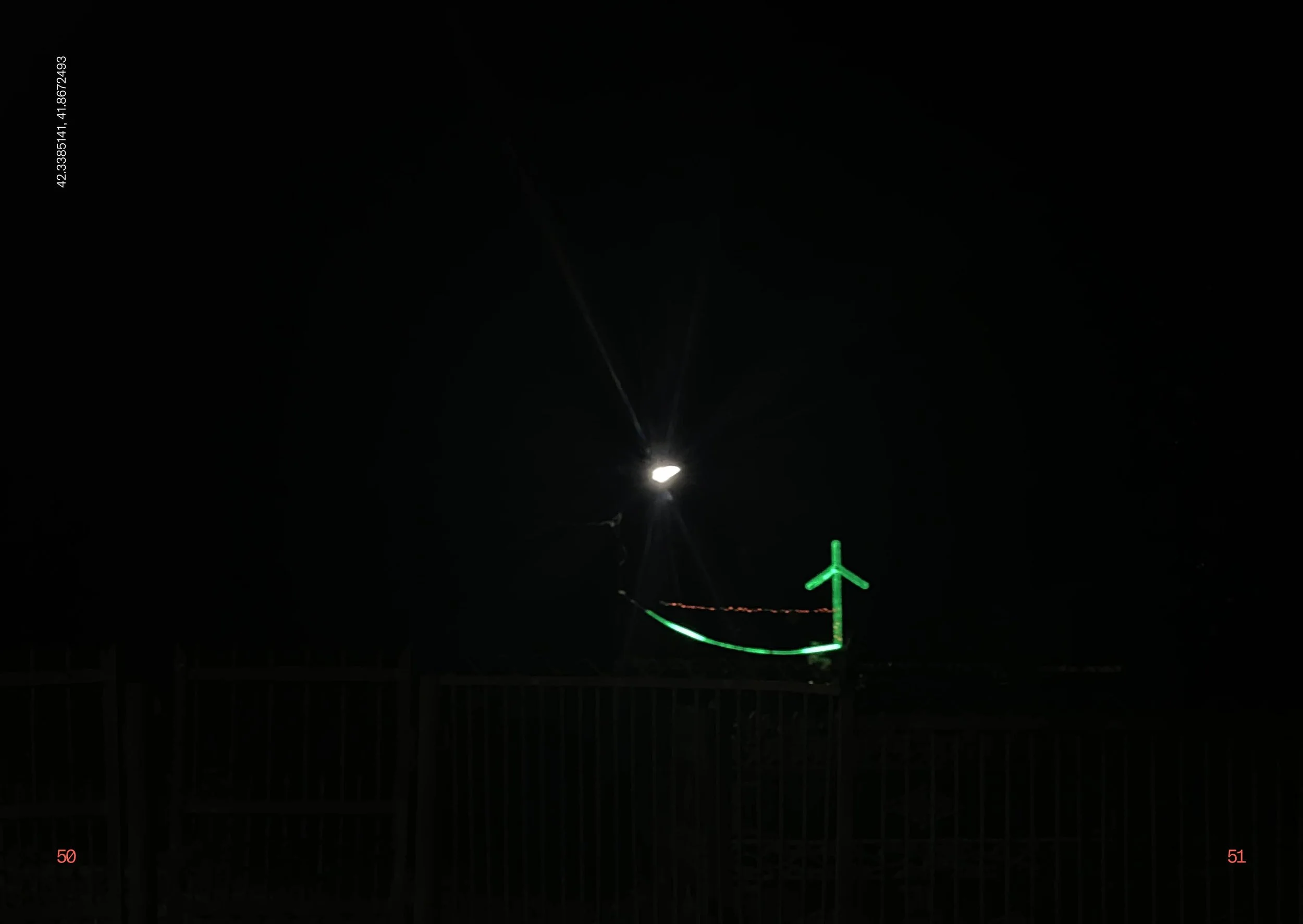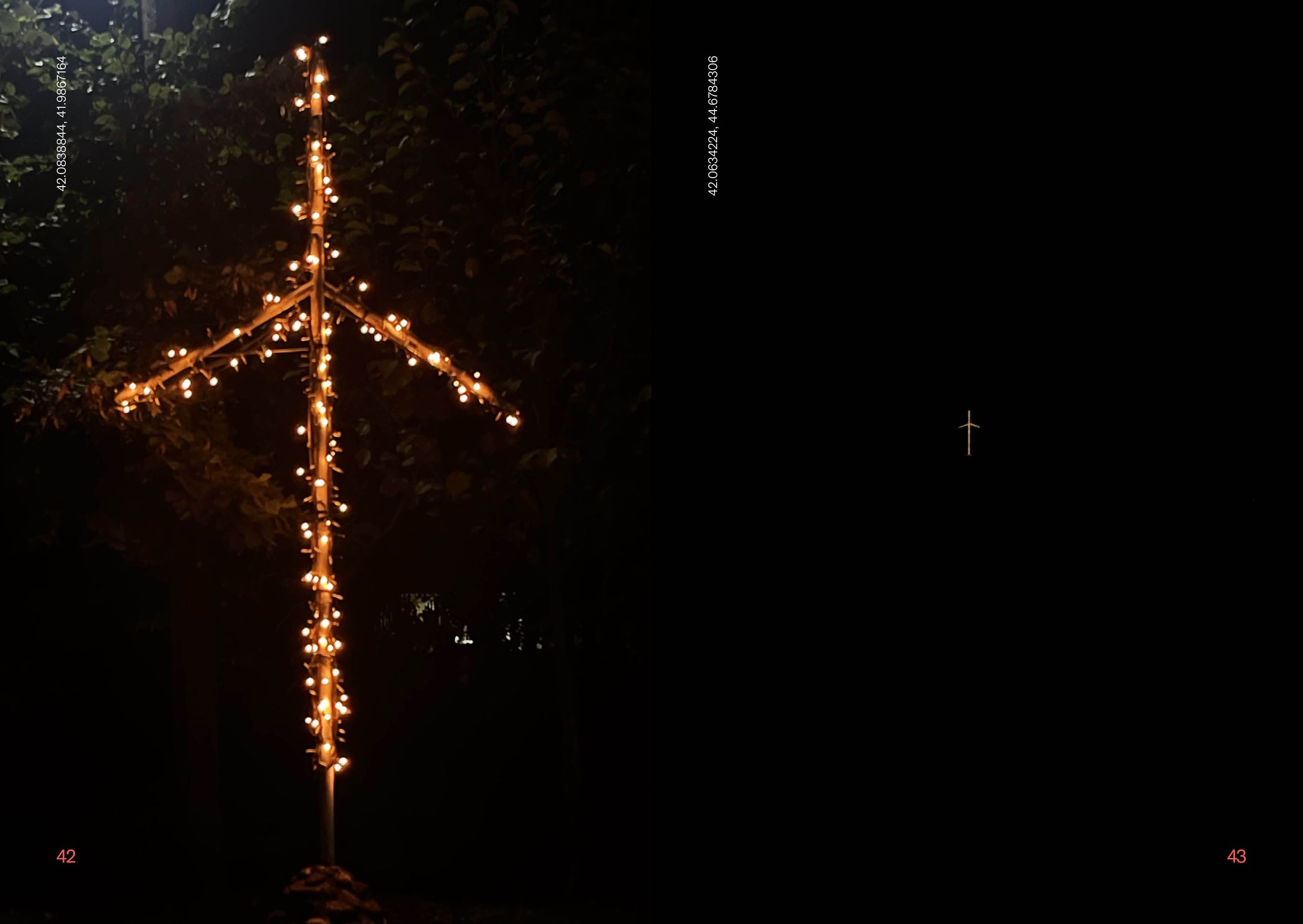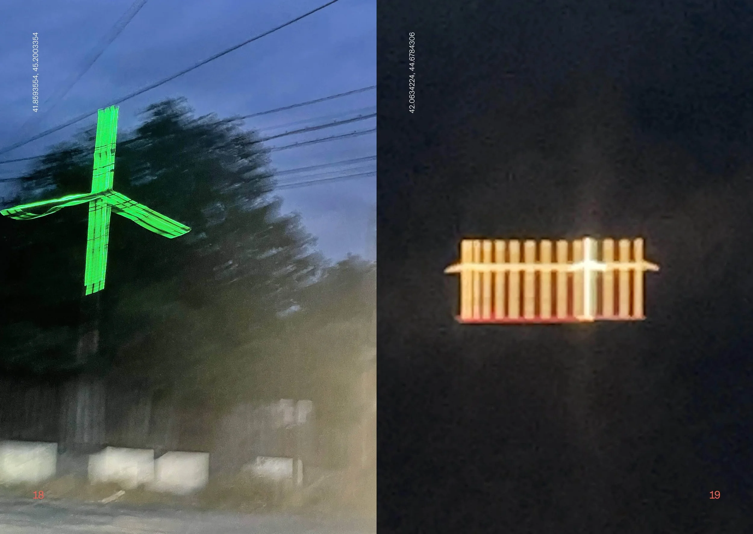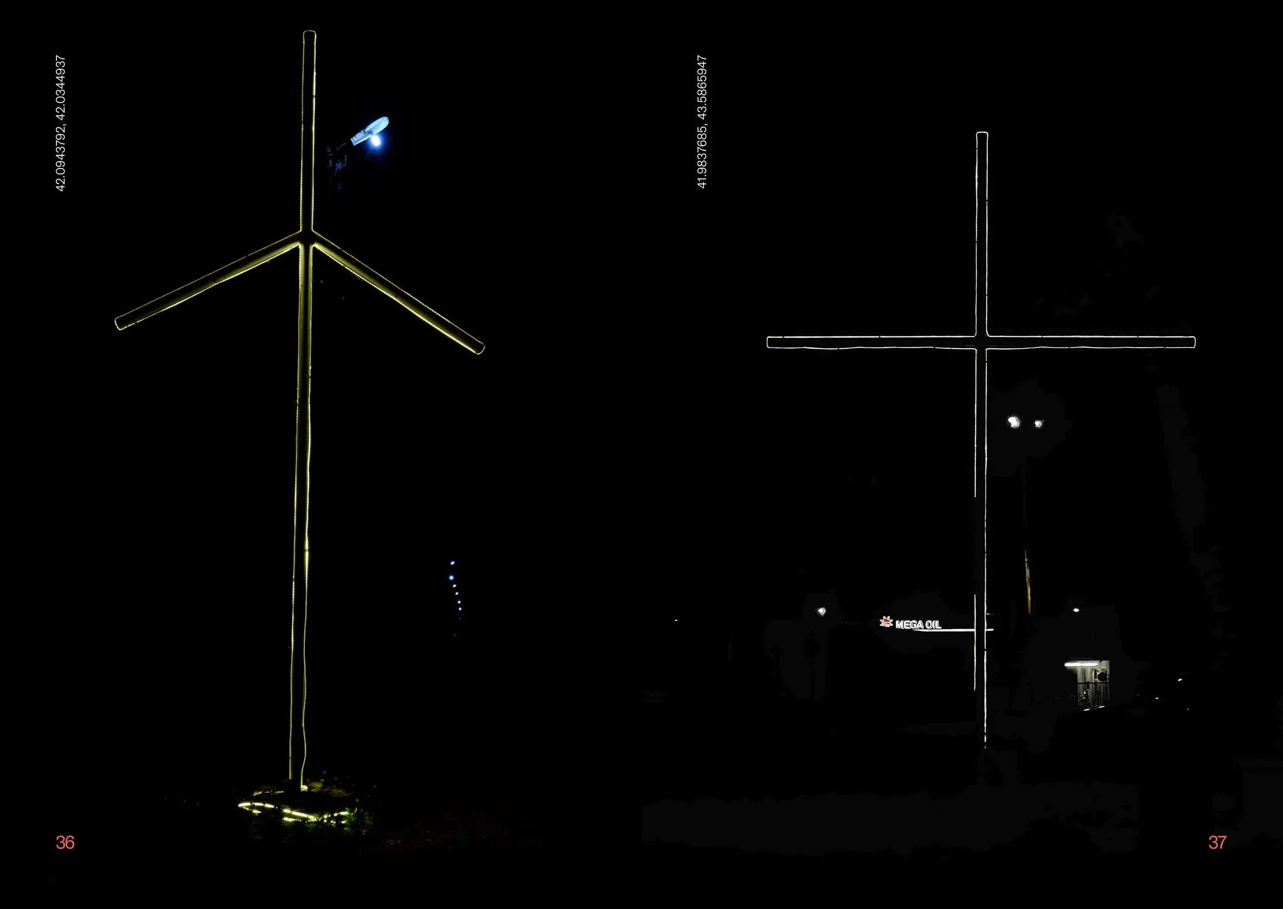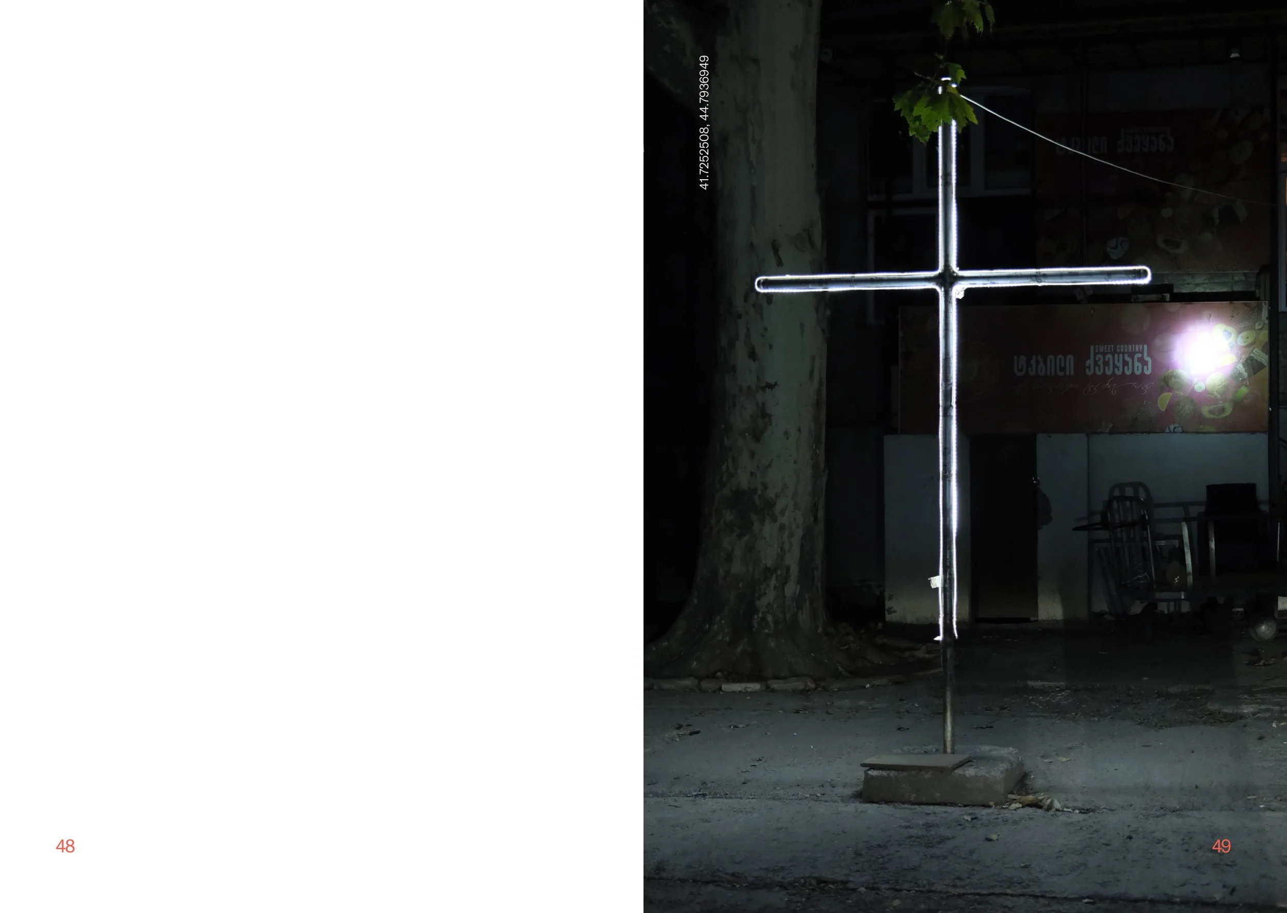 Portals: 42.3154070, 43.3568920 is a typology of neon crosses scattered across rural Georgia. Marked with the exact coordinates of the place of death, these mounted crosses serve as memorials for the deceased.
