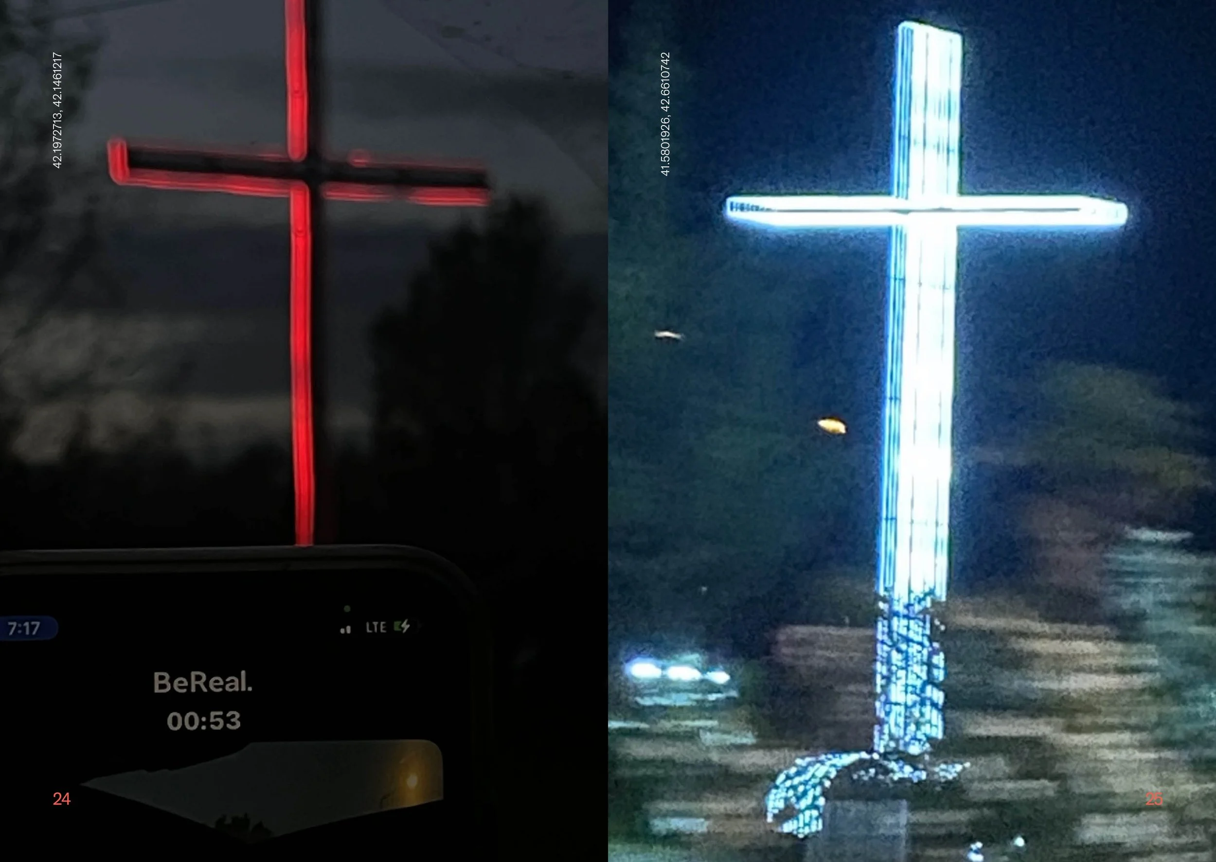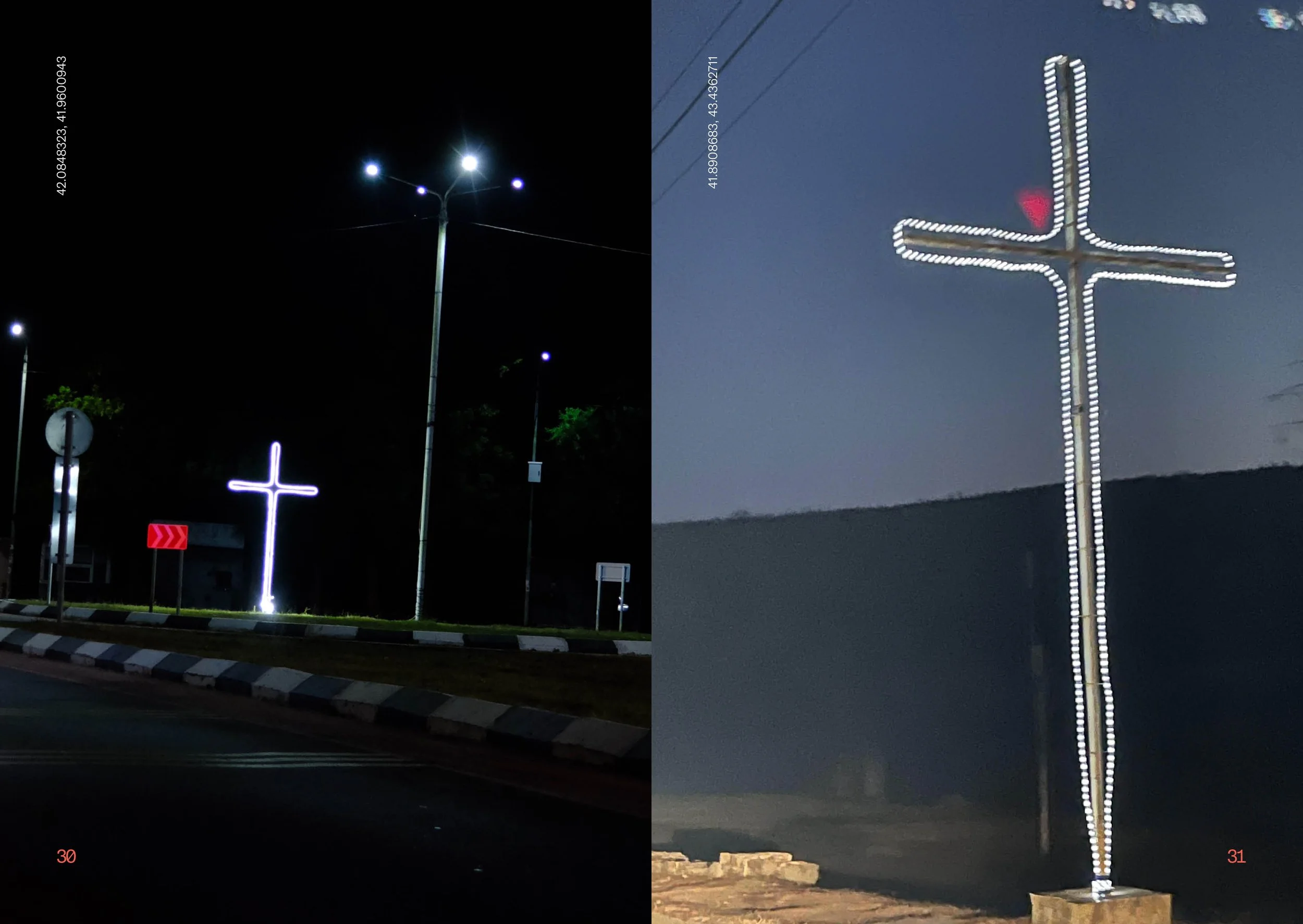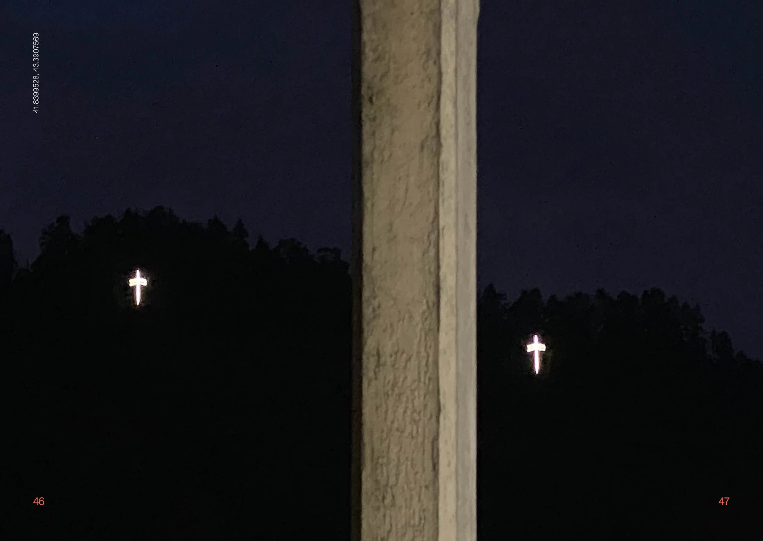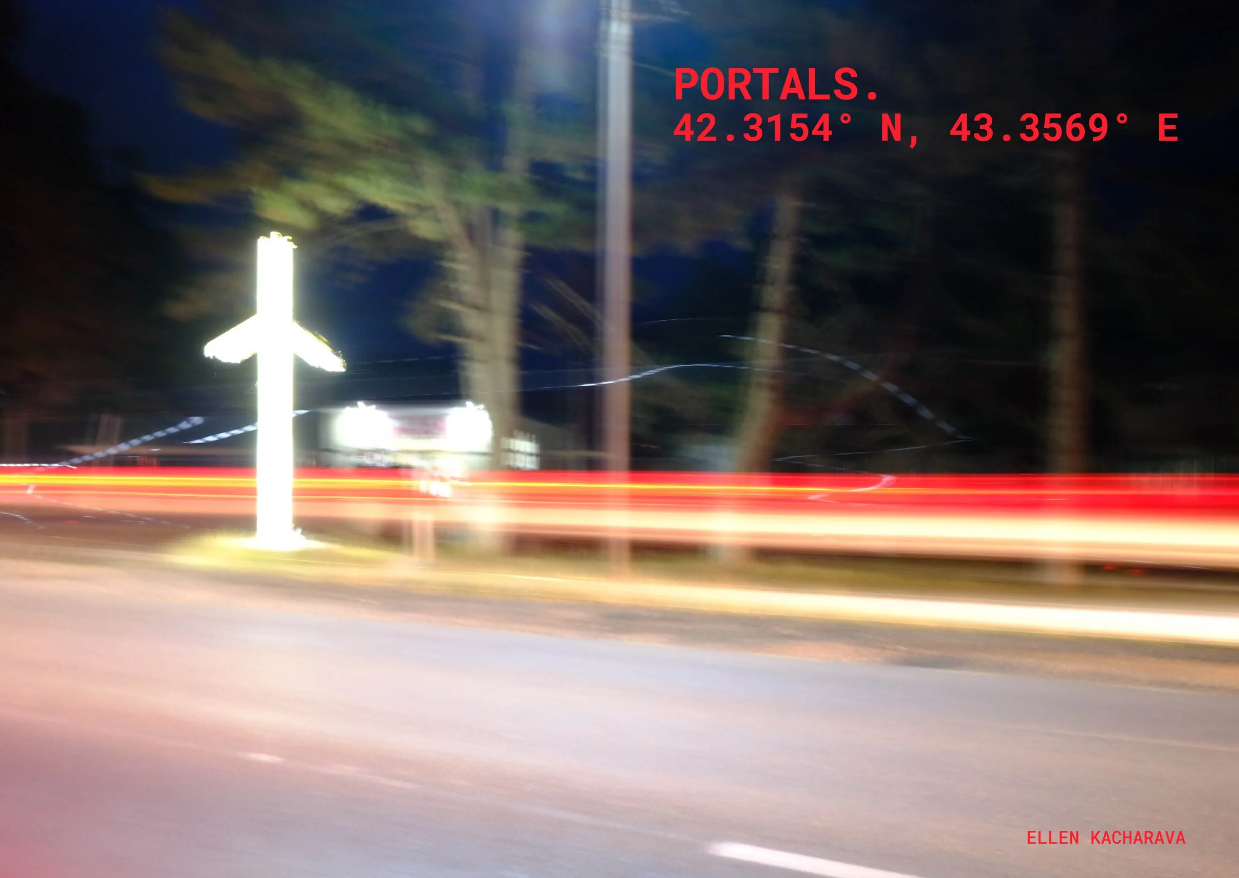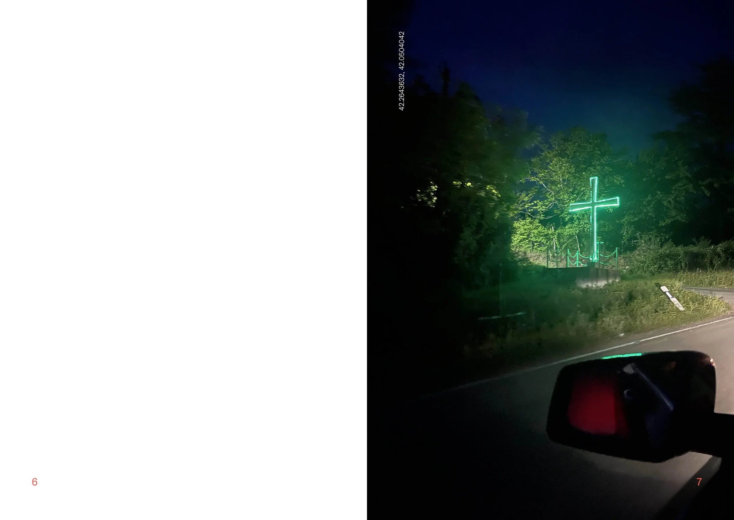 “Portals: 42.3154070, 43.3568920” is a deeply personal project born from my fascination with neon crosses scattered throughout my home country. As memorials for the deceased, these crosses intrigued me due to their stark contrast with the asceticism of Orthodox Christianity. I began collecting a typology of these vibrant symbols along roads and various locations, documenting their presence in the landscape and examining the concept of communication with the otherworldly.